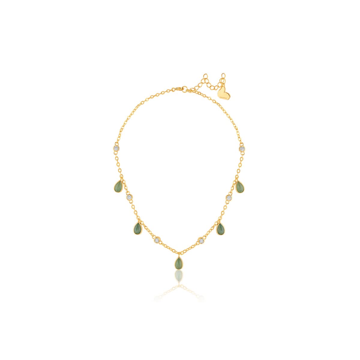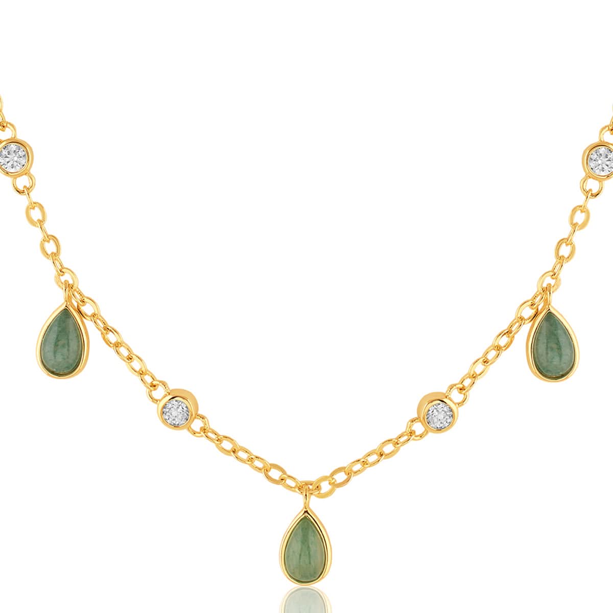 The Verdant Vision Necklace features green aventurine stones set along a sleek 18k gold-plated brass chain. Hypoallergenic and eye-catching, it draws from healing stone energy to blend beauty with balance.