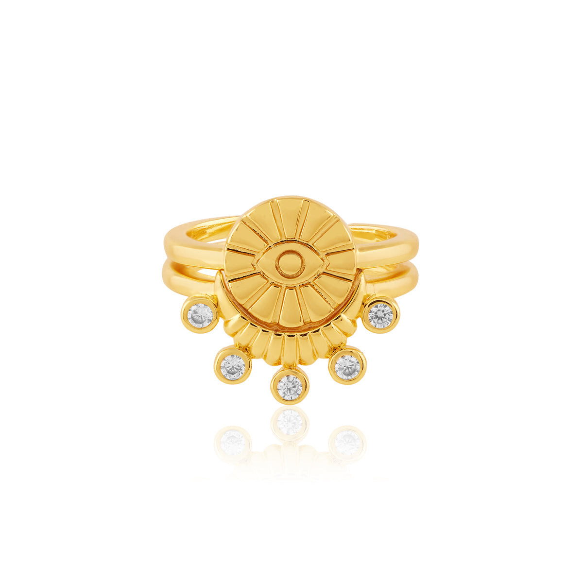 Redefine festive glamour with our stackable ring. Crafted in brass with 18k gold plating and shimmering zirconia stones, it reimagines temple-inspired motifs as future heirlooms. Wear solo or stack for impact—perfect for weddings, parties, and soirées. Shop your sparkle now.