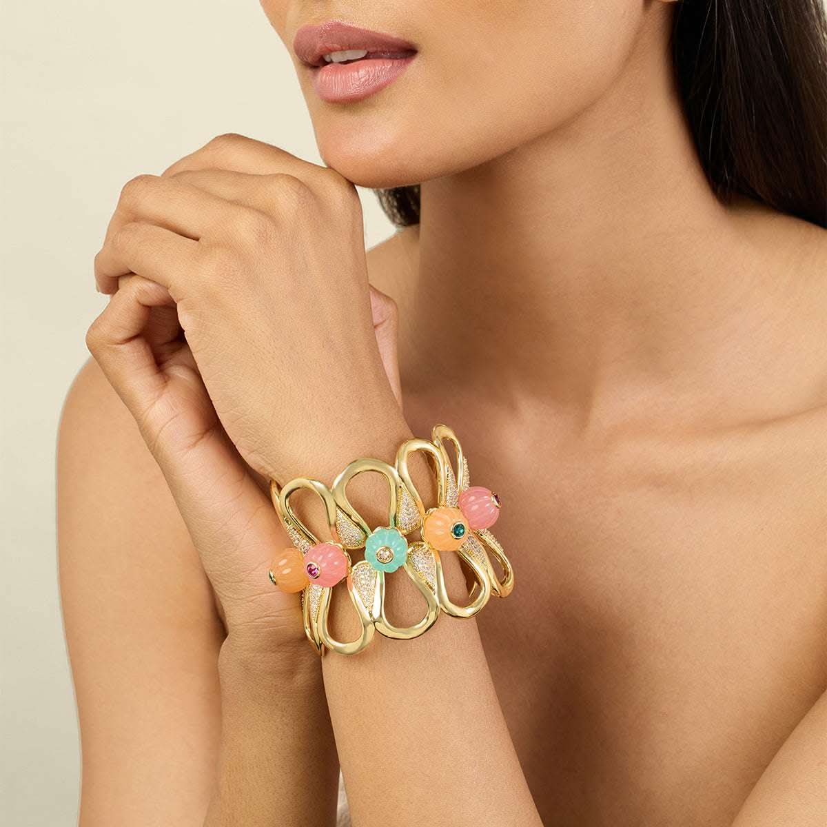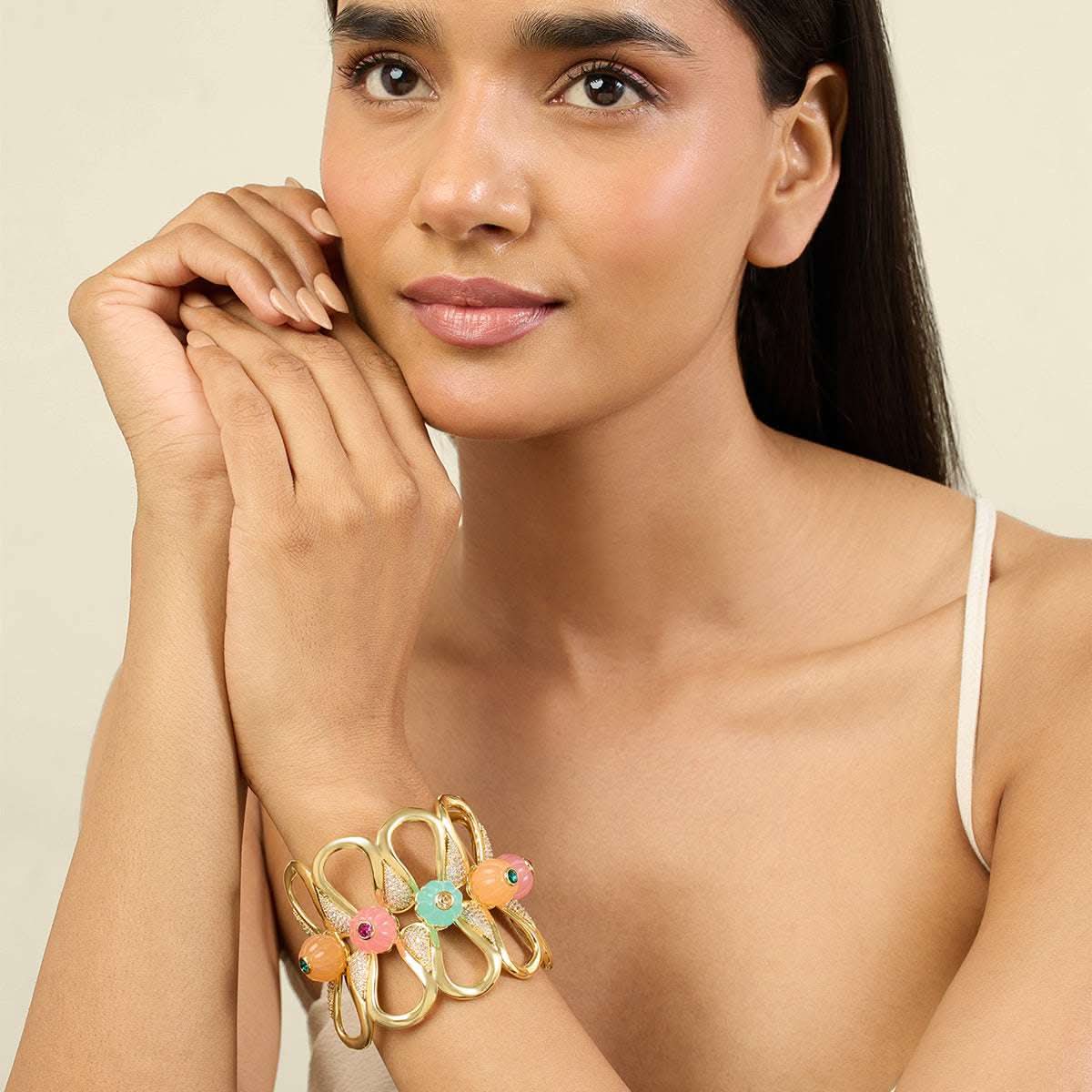A striking statement piece, this cuff in pink, blue, dark rose, and gold features crystal zirconia and resin work, inspired by delicate garden motifs like flowers, snails, and dragonflies. Crafted in 18k gold-plated brass, it’s hypoallergenic and luxurious.