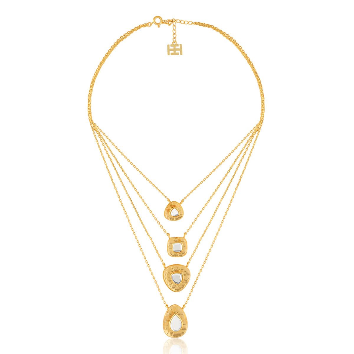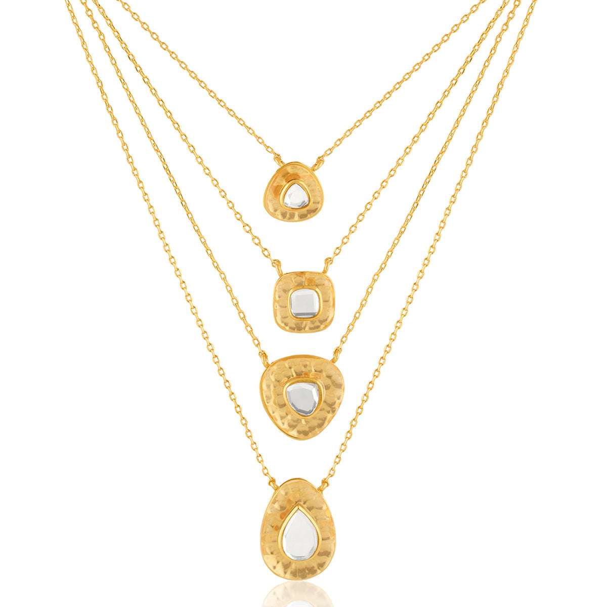 The Zoori Layered Necklace features gold plating with e-coating, creating a durable and long-lasting shine. Crafted with layered resin and brass, this multilayer necklace adds a touch of elegance and reflects light beautifully. Elevate your festive style with this stunning piece.